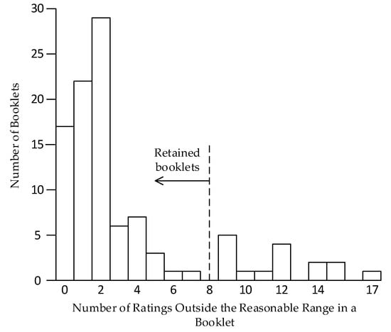 Each booklet had 48 words and phrases for rating. The number of unreasonable ratings found in each of the 100 booklets varied from zero to 17. The histogram in Figure 4 uses vertical bars to show the number of booklets containing various numbers of unreasonable ratings, as indicated on the horizontal axis. The histogram shows a natural split in booklets at the number eight. To the left of eight were 84 booklets with less than eight unreasonable ratings. These booklets were retained for the second process. To the right of eight, there were 16 booklets with more than eight unreasonable ratings. These booklets were removed before undertaking the subsequent analyses.