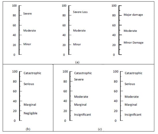 Another option for RAM designers is the order of categories for severity. The order in Figure 1 uses the right column for the highest severity category (catastrophic). Many RAM designers place the highest severity category in the left column—the approach traced to the U.S. Defense Department [,] and recently recommended by Pons for risk assessments in New Zealand []. For likelihood, the common approach is to order the categories by decreasing likelihood, as in Figure 1. However, the opposite approach has been used [,].