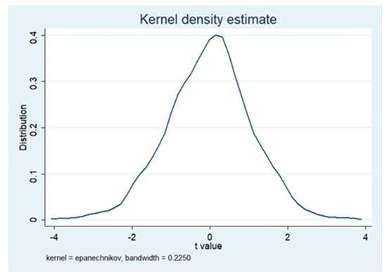 We adopted a placebo test [85] to identify whether our results are driven by unobservable factors at regional, industrial, and year levels. Specifically, a treatment group of the pilot ETS was randomly set to ensure that the selection of the pilot did not affect the dependent variable, that is, the interaction term coefficient of random regression equals 0. We conducted 1000 random samplings and performed regression according to Formula (1). Figure 1 reports the t-value distribution of 1000 results, most of which are distributed near zero. The mean of the coefficient after random sampling is 0.0017, which is close to 0 compared to the above DDD model results and is not significant. This proves that our estimates are hardly affected by unobservable factors at the regional, industrial and year levels.