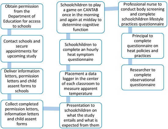 Figure 2, below, represents the study flowchart. Firstly, the team will request permission from the Gauteng Department of Education to gain access to public schools. Secondly, the team will approach the parents or legal guardians of learners for consent to include their child in this study as well as the school governing body and principals. Lastly, after receiving parental consent, the team will approach all of the learners from the schools for assent to participate in the study prior to commencement. A temperature logger will be placed in the centre of each classroom, schoolchildren will then play a game on CANTAB and fill in a heat-related symptom questionnaire and a nursing practitioner will be available for screening and completion of a lifestyle practices questionnaire. School principals and the researcher will also be required to complete questionnaires.