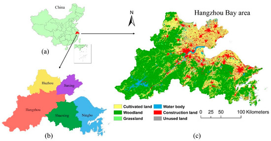 (a) Geographical location of the Hangzhou Bay area; (b) five prefecture-level cities in the Hangzhou Bay area; (c) land use of the Hangzhou Bay area in 2015.