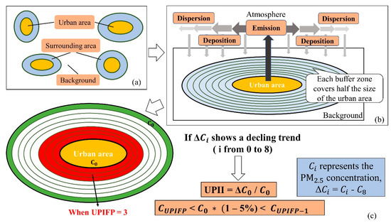 The overall concept of this paper is shown in Figure 2. Based on the rationale mentioned above, the method can be defined as according to several steps: (1) extract the urban areas; (2) generate the equal-area buffer zones as the surrounding areas; (3) calculate the average PM2.5 concentration in each urban and surrounding area; (4) analyze the concentration difference from the urban area to the outermost buffer zone; (5) determine whether the UPI phenomenon exists or not; and (6) if so, calculate the UPII and UPIFP of each urban area.