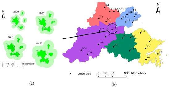 Urban areas in the Hangzhou Bay area. (a) Urban areas and buffer zones in Hangzhou (urban1-1) in 2000, 2005, 2010, and 2015; (b) location of the 27 urban areas.