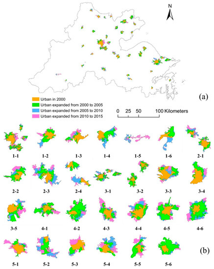 To visualize the expansion of each urban area more clearly, the specific expansion of each urban area is shown in Figure 4b (the scale of each urban area varies). Each urban area expanded from 2000 to 2015, but considering the expansion form and size, each urban area differed. In terms of the expansion form, basically, every urban area expanded outward from the original urban area (referring to the urban area in 2000) in all directions over this period without terrain and hydrological restrictions. In addition, the area of each urban area was analyzed as well. According to the calculation of the area, urban1-1 (which is the urban area whose corresponding number is 1-1, the same as below) possessed the largest area all the time, followed by urban3-1. Four urban areas expanded more than three times from 2000 to 2005, i.e., urban4-6 expanded by 348.31%, urban4-2 expanded by 659.02%, urban5-2 expanded by 369.92%, and urban5-6 expanded by 449.12%.