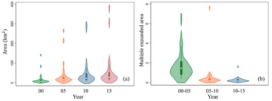 The urban expansion that occurred in the Hangzhou Bay area from 2000 to 2015 is shown in Figure 4a. The total area of the extracted urban areas was 470.41 km2 in 2000, 1087.96 km2 in 2005, 1325.15 km2 in 2010, and 1584.68 km2 in 2015. The expansion that occurred from 2000 to 2005 occupied 55.42% of the total urban expansion from 2000 to 2015, making 2000–2005 the period with the most rapid urban growth in the Hangzhou Bay area, followed by 2010–2015 (23.29%), and the period with the least rapid growth was 2005–2010 (21.29%). Violin plots of the study area and multiple expanded areas are shown in Figure 5a,b, respectively. Combining the kernel density estimation curve and box plot, the violin plots indicated that the median area increased from 2000 to 2015, while the median expanded area decreased over this period. Although violin plots are less common than box plots, they show similar information. In addition to the median and interquartile range, a violin plot shows the distribution of the data with a rotated smoothing curve.
