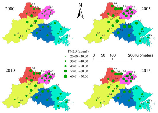 By evaluating the PM2.5 concentrations in these four years, the most significant point is that the PM2.5 concentrations in 2000 were considerably lower than that in the other three years. The minimum concentration in 2000 was 25.81 μg/m3, while it was 36.12 μg/m3 in 2005, 36.37 μg/m3 in 2010 and 34.16 μg/m3 in 2015. At the same time, the maximum concentration in 2000 was 54.03 μg/m3, while it was 65.75 μg/m3 in 2005, 59.31 μg/m3 in 2010, and 58.57 μg/m3 in 2015. In summary, both the minimum and maximum concentrations were the lowest in 2000.