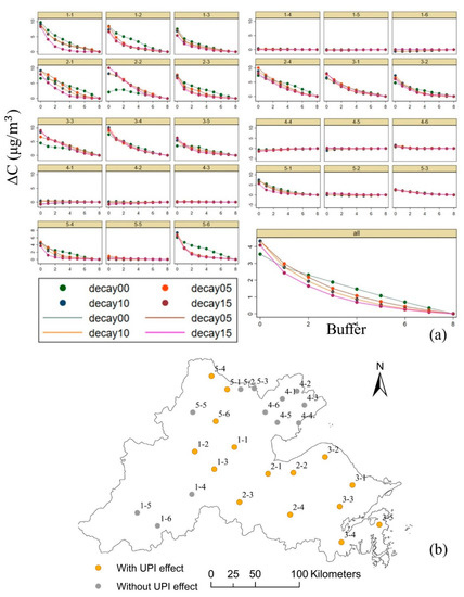 Regarding each urban area, ΔC (the PM2.5 concentration difference between the urban area/buffer zone and the outermost buffer zone) of the 27 urban areas in 2000, 2005, 2010, and 2015 are shown in Figure 7a. In 15 of the 27 urban areas, ΔC clearly decayed from the urban area to the buffer zones, including urban1-1, urban1-2, urban1-3, urban2-1, urban2-2, urban2-3, urban2-4, urban3-1, urban3-2, urban3-3, urban3-4, urban3-5, urban5-1, urban5-4, and urban5-6, which were regarded as urban areas with UPI effects in this paper. The distribution of the urban areas with the UPI effect is shown in Figure 7b. Except for urban2-2, for each of the remaining 14 urban areas, the shapes of the four curves are roughly similar.