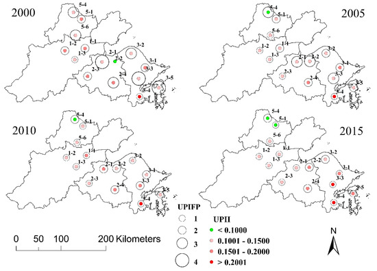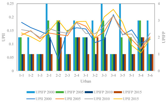 The spatiotemporal dynamics of the UPII and UPIFP for the urban areas with UPI effects in the Hangzhou Bay area are shown in Figure 8. For comparison purposes, the UPII in the four years are all classified with 0.1, 0.15, and 0.2. Overall, the UPII in each urban area remained relatively stable over time (Figure 9). From the perspective of the spatial distribution, the urban areas with a higher UPII were distributed in the central and southeast regions of the Hangzhou Bay area. The urban area with the highest UPII was urban3-4, whose UPII exceeded 0.2 every year. In addition, the UPII of urban1-1, urban1-2, urban1-3, urban2-1, urban2-3, urban2-4, urban3-1, urban3-2, urban3-3, urban3-5, and urban5-6 were higher than 0.1 in these four years.