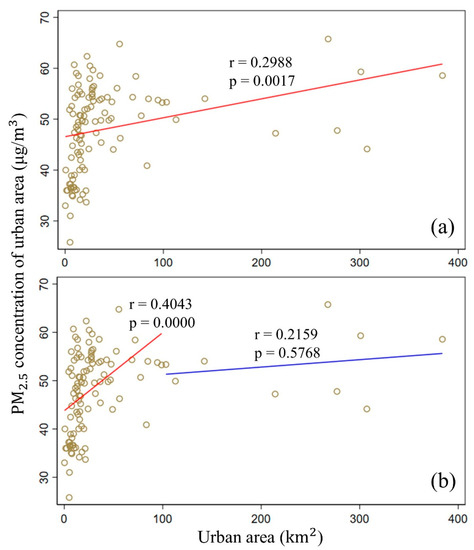 Relationship between the area and PM2.5 concentration in the urban areas. (a) All urban areas; (b) urban areas divided at an area of 100 km2.
