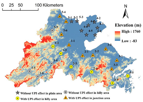 Junction of plains and hills: the urban areas were zonally distributed, with both integrity and independence. Compared with the urban areas surrounded by hills, the expansion was relatively less restricted by the terrain but more susceptible to the influence of neighboring urban areas. Compared with the plain area, the surrounding woodlands could effectively settle pollutants. In this paper, the urban areas located in the junction area exhibited a high probability of the UPI effect, and the decrease in UPIFP was also due to the shorter distance between the urban boundaries and woodlands.
