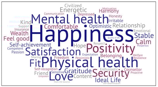 In the interviews, participants were asked to reflect upon “what words can you think of to communicate or describe wellbeing?” Figure 1 visualises the 54 meaningful words and phrases that were mentioned, with larger words indicating greater frequency (min = 1, max = 22), and no specific meaning for the colours. Aligned with the themes described above, “happiness”, “physical health”, “mental health”, “love”, and “security” were the most frequently mentioned words/phrases.