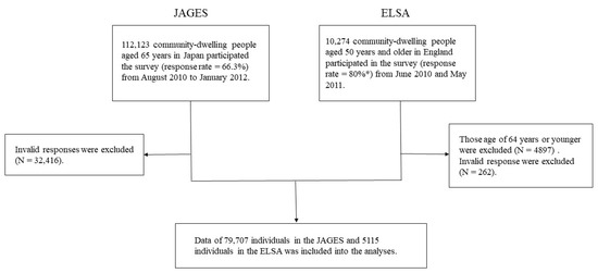 We used cross-sectional data from the Japan Gerontological Evaluation Study (JAGES) [22] and the English Longitudinal Study of Ageing (ELSA) [23]. The JAGES and ELSA are both ongoing prospective cohort studies investigating social and behavioural factors associated with a functional decline or cognitive impairment among older individuals. The target population of the JAGES was 169,215 community-dwelling people aged 65 years and older selected from 31 municipalities in 12 prefectures in Japan from August 2010 to January 2012 (Wave 3). A total of 112,123 people participated in the JAGES (response rate = 66.3%). The ELSA data were collected between June 2010 and May 2011 (Wave 5) from a total of 10,274 community-dwelling people aged 50 years and older living in England. Those certified for long-term care in JAGES and those under the age of 65 years in ELSA were excluded. Then, both JAGES and ELSA data obtained from older adults aged over 65 years and older with valid responses (no missing data) in the variables included in this study were used for our analyses (Figure 1).