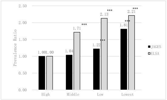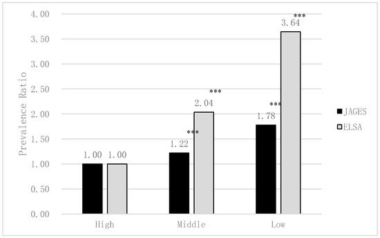 The association between edentulism and educational attainment in Japan and England estimated by Poisson regression analyses (adjusted for sex and age; JAGES N = 79,707, ELSA N = 5115). *** p < 0.001.
