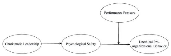 When facing high performance pressure, individuals who experience high psychological safety are more likely to conduct UPB, given that charismatic leaders emphasize collective identity, which may motivate followers to do whatever they can to accomplish organizational goals []. In particular, charismatic leaders are good at motivating followers to demonstrate considerable effort and behaviors to achieve enhanced performance []. When followers perceive performance gaps, they will seek to overcome these to get the job done []. The completion of tasks and attitudes toward the completion of work contribute to the generation of risk-taking. Psychological safety is described as a critical cognition in determining unethical behavior because of the interpersonal risks inherent in UPB, given that psychological safety provides a mechanism through which followers perceive the lower potential costs of engaging in UPB.