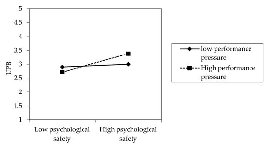Hypothesis 4 proposed that performance pressure would moderate the relationship between psychological safety and UPB, such that this positive relationship would be stronger in the presence of high (vs. low) performance pressure. Specifically, performance pressure had a significant moderation effect on the relationship between psychological safety and UPB (γ = 0.14, p < 0.05) in Table 4, Model 6. We plotted this moderation effect in Figure 2. Tests of simple slopes (at +/−1 SD of performance pressure) indicated that when performance pressure was high, psychological safety was significantly positively related to UPB (b = 0.33, t = 4.67, p < 0.01). While the simple slope computed at one standard deviation below the mean, the relationship between psychological safety and UPB was nonsignificant (b = 0.05, t = 0.53, ns). These results suggest that the moderation effect was statistically significant when performance pressure was high. Therefore, Hypotheses 4 was supported.