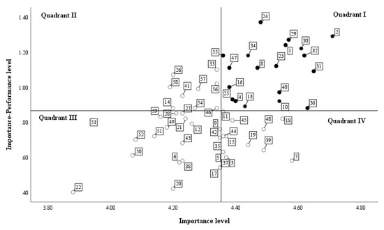 Participants’ mean performance score over all items was 3.48 (SD = 0.86), whereas the overall average importance score was 4.35 (SD = 0.50). The average scores significantly differed between performance and importance (t = 13.65, p < 0.001) and all 59 items exhibited statistically significant differences between ratings of performance and importance (Table 2).