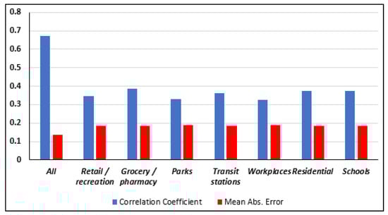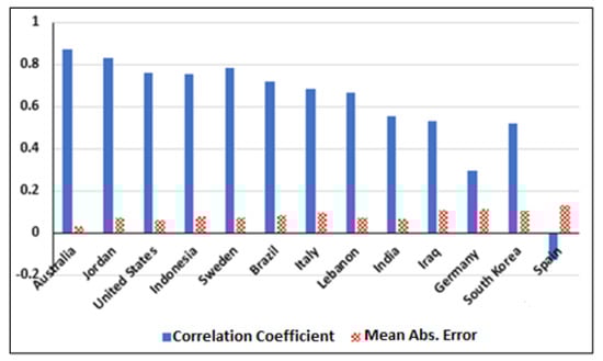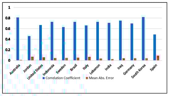 The aim of this dataset is to study the efficiency of social distancing and lockdown measures at any time. The data were classified using various models of Decision Table, Random Forest (RF), and K-Nearest Neighbor (KNN). RF is a classifier that produces multiple decision trees, using a randomly selected subset of training samples and variables [], while KNN assumes that similar things exist in close proximity and are near to each other []. In the initial stage of analytics, the dataset was classified for all countries. Two models were used in these analytics, KNN and Random Forest. The data split was conducted by the test mode of 3-fold cross-validation for all datasets. KNN was used for the combination of all independent attribute classifications, while Random Forest was used for individual attribute classifications. Figure 1 shows the correlation coefficient average and the mean absolute error (MAE) for all countries. The MAE measures the average magnitude of the errors in a set of forecasts without considering their direction.