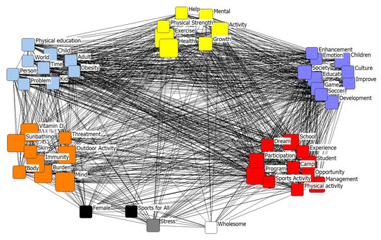Second, a CONCOR analysis was performed to analyze the structures of the relationships among the latent sub-clusters in the network cluster. The results are shown in Figure 1 and Table 6. Based on these results, homogenous groups were identified according to relationships and correlations, resulting in five clusters. The first cluster (visualized with yellow) comprised the terms “exercise”, “health”, “activity”, “mental”, “growth”, “physical strength”, and “help”, and was categorized as “exercise and health”. The second cluster (visualized with sky-blue) comprised the terms “child”, “kid”, “physical education”, “adult”, “world”, “time”, “problem”, “person”, and “obese”, and was categorized as “child to adult.” The third cluster (visualized with purple) comprised the terms “children”, “education”, “social”, “culture”, “development”, “improvement”, “soccer”, “game”, “emotion”, and “enhancement”, and was categorized as “sociocultural development”. The fourth cluster (visualized with orange) comprised the terms “mind”, “immunity”, “vitamin D”, “outdoor activity”, “burden”, “sunbathing”, “body”, “skin”, and “treatment”, and was categorized as “therapy”. The fifth cluster (visualized with red) comprised the terms “program”, “management”, “school”, “student”, “participation”, “opportunity”, “dream”, “experience”, “physical activity”, and “sports activity”, and was categorized as the “program” cluster. However, female, sports for all, stress, and wholesome could not form a cluster (visualized with black, gray, and white).
