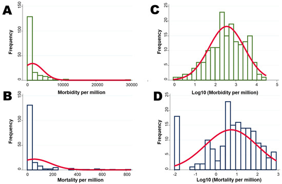 Histograms of morbidities and mortalities drawn as a normal density plot. (A) Morbidity per million; (B) mortality per million; (C) log10 transformed morbidity; and (D) log10 transformed mortality.