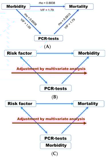 First, associations represented by rho and VIF between morbidity (n = 173), mortality (n = 173) and PCR-tests (n = 155) are shown (Figure 2A). These three variables were predicted to have very strong and positive associations with each other. However, VIFs were less than 2 among these three factors. Multicollinearity is considered to be present when the VIF is higher than 5 to 10 [24]. Thus, any variable with a VIF < 5.0 was considered for inclusion in multiple linear regression analyses. Considering the number of PCR-tests per million population may exhibit associations with morbidity, adjustment was performed for the PCR-test number in every analysis when screening for the risk factors of COVID-19 morbidity per million population (Figure 2B). Considering morbidities and the number of PCR-tests per million population may exhibit associations with mortality, adjustment was performed for the morbidity and PCR-test number in every analysis when screening for the risk factors of COVID-19 mortality per million population (Figure 2C).