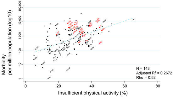 Scatter plot showing the association between insufficient physical activity and COVID-19 morbidity rates.