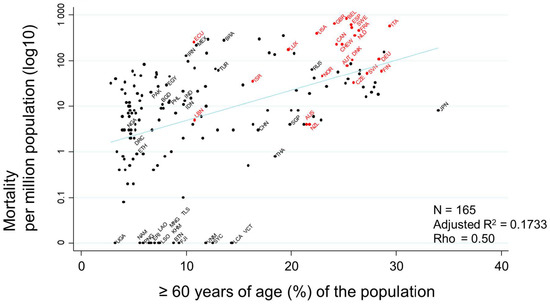 Scatter plot showing the association between ≥60 years of age (%) of the population and mortality rate. Mortalities per million population on 17 July 2020 transformed to the common logarithm (log10) are presented in the graph. Since the variable of ‘percentage of population ≥ 60 years of age (%)’ showed a non-normal distribution, Spearman’s rank correlation was applied to calculate rho, to quantify the strength of the association. Countries that had never had or that had stopped their national BCG vaccine program are indicated in red, while countries that currently follow a national BCG vaccine program are indicated in black. Selected country names are shown using three-letter country codes.