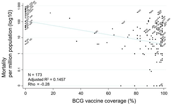 Finally, evaluation of the association between ‘BCG vaccine coverage’ and mortality, demonstrated as a scatter plot, indicated a moderately negative association (rho = −0.29) (Figure 7). Countries with higher BCG vaccine coverage showed a tendency toward lower mortality. Additionally, COVID-19 mortality rates did not have significant associations with BCG strain, e.g., Tokyo 172. Moreover, there were no significant associations between mortality and either the year of stopping or introducing a national BCG vaccine program (data not shown).