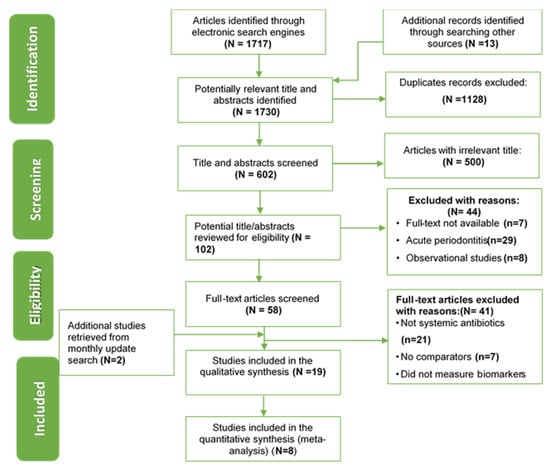 Therefore, this systematic review assessed the effectiveness of systemic antibiotics as an adjunctive therapy to mechanical debridement in the improvement of inflammatory systemic biomarkers, as compared to mechanical debridement alone, among adults with chronic periodontitis, using evidence from published randomized controlled trials.