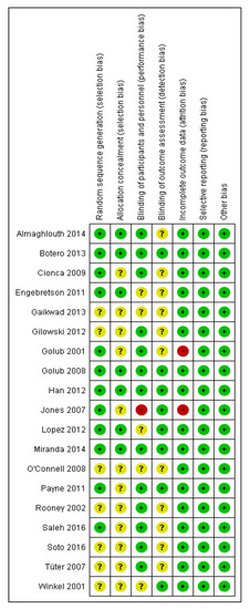 - Higgins, J.P.; Altman, D.G. Assessing risk of bias in included studies. In Cochrane Handbook for Systematic Reviews of Interventions; Cochrane: London, UK, 2008; pp. 187–241. [Google Scholar]