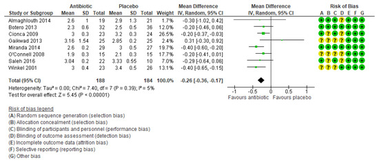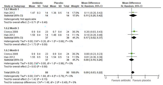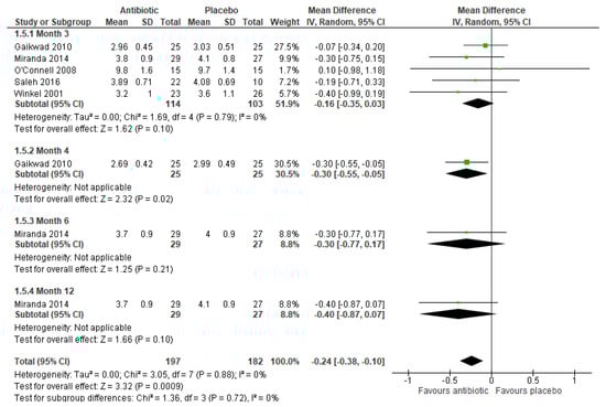 Five studies reported on CRP [13,19,29,31,35]. From our GRADE assessments, we found little or no antibiotic effect on CRP levels (low certainty of evidence after downgrading two levels for indirectness). In one study [19], peak values of CRP were observed in four participants at baseline (values ranging from 13.4 to 52.6 µg/mL) and in three participants at three months (14.1 to 33.4 µg/mL); however, the study authors gave no indication of how many of the participants with these peak values received antibiotics. Another study [29] assessed CRP levels in participants with metabolic syndrome where 82 participants received amoxicillin and metronidazole while 83 participants received placebo. Although the mean CRP levels decreased significantly at 9 and 12 months, there were no significant differences between the two treatment groups at three months. In a third study [31], the SDD antibiotic intervention significantly reduced median hs-CRP by 18% over a period of two years compared to the placebo and the ratio of medians of SDD versus placebo (0.82, 95%CI: 0.70 to 0.97, p = 0.02). A fourth study [13] also assessed the effect of the SDD antibiotic on high-sensitivity CRP (hs-CRP) compared to placebo; however, although there were significant improvements between baseline and six weeks in both groups, there was no significant difference between groups at six weeks (p = 0.628). The fifth study [35] reported hs-CRP at baseline and 12 weeks and found that treatment with azithromycin antibiotic decreased the hs-CRP from 4.33 mg/L to 2.99 mg/L while the placebo treatment increased from 4.59 mg/L to 5.61 mg/L. Although they did not compare these intra-group changes, they found no significant differences between groups at 12 weeks (p = 0.4630); we could not calculate the 95%CI for mean difference since standard deviations were not reported.