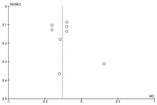 Eight trials [15,19,20,21,23,30,33,34] measured PD (mm) at three months and a random effects meta-analysis of their results yielded a statistically significant antibiotic effect of reducing PD by 0.26 mm (mean difference [MD] −0.26, 95% confidence interval [CI]: −0.36 to −0.17, n = 372 participants, 8 trials, Figure 3) and there was no significant heterogeneity between trials (Chi2 = 7.40, degrees of freedom [df] = 7, p = 0.39, I2 = 5%). A funnel plot was constructed and it showed no evidence of publication bias (Figure 4). From our GRADE assessments, this was moderate certainty of evidence after downgrading one level for indirectness since the studies were done mainly in developed countries only.