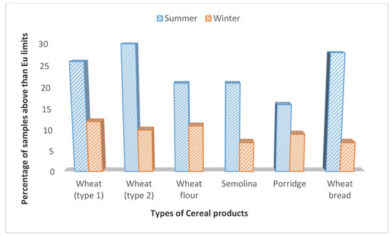 The incidence and occurrence levels of DON were investigated in 232 samples of wheat and products from the summer season and in 217 samples from the winter season, as represented in Table 2. The highest average amount of DON was present in wheat flour, i.e., 1325.5 ± 24.7 µg/kg samples from the summer season and the lowest mean level was found in wheat porridge (934.1 ± 19.2 µg/kg) from the summer season. However, the highest mean levels of DON from the winter season were 1080.7 ± 30.5 µg/kg in wheat flour samples. The results have shown that 104 (44.8%) samples out of 232 from the summer season were found to be contaminated with DON in wheat and wheat products, and 91 (41.9%) out of 217 samples were found to be positive with DON from the winter season. The results of DON in summer and winter samples of wheat and wheat products were statistically significant at α 0.05, except in wheat (type 1) samples, which were nonsignificant at α 0.05. The samples were 54 (23%) from summer, and 20 (9.2%) samples from winter of wheat, and wheat products had levels of DON higher than EU’s recommended limits, as shown in Figure 1.