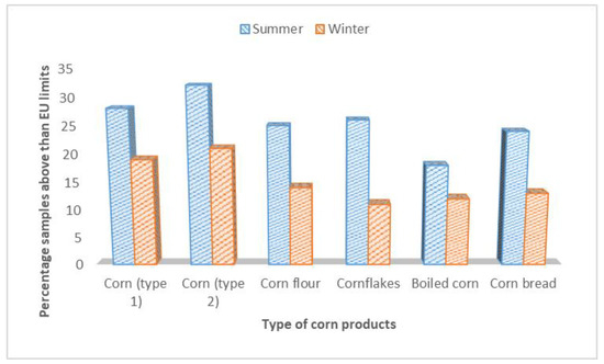 The incidence and occurrence levels of DON were investigated in 142 samples of corn and products from the summer and 128 samples from winter seasons, as revealed in Table 3. The results have documented that 87 (61.2%) samples out of 142 were found positive from the summer season, and 57 (44.5%) samples from the winter season were found contaminated with DON. The highest mean level of 1434.8 ± 25.5 µg/kg in corn flour samples from summer season was found, and the lowest mean level of DON was found in cornbread 620.8 ± 17.8 µg/kg, from the winter season. The incidence levels of DON in corn and corn products from the summer season were statistically significant from the samples of winter season (α 0.05) except cornbread samples. The samples of corn and corn products having levels of DON higher than the recommended limits of the EU are compared in Figure 2.