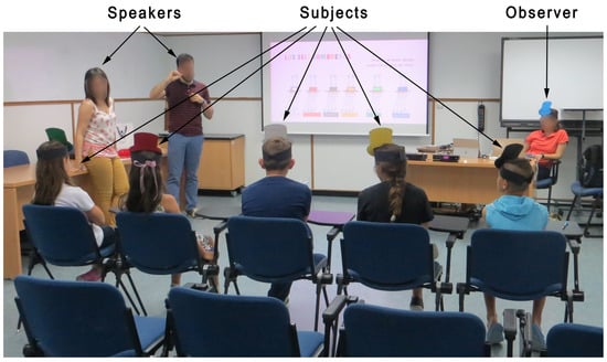 The classroom was arranged in such a way that the speakers never stood in front of the Kinect devices (Figure 2). Thus, the speakers would cross behind the chairs when it was necessary to hand out any type of material to the assistants or to answer any question.