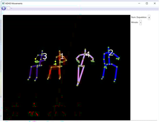 The computer application ADHD Movements was developed for the analysis of the movement of several subjects using Kinect. The version of Kinect for Windows allows developers to make their own programs using gestures and body movements in a wide variety of applications, for this reason it is considered an innovative interaction interface between people and computers, in addition to its simplicity in the acquisition of data []. This application was developed with Microsoft Visual Studio and using the Kinect for Windows Software Development Kit (SDK) 2.0 that enables the creation of applications that support gesture recognition. For this, one of the main characteristics of this SDK is the detection of the human body that it is represented as a skeleton consisting of segments (such as forearm, hand or foot), which are connected to each other by joints (such as elbow, wrist or ankle). ADHD Movements detects the number of visible skeletons and, to allow the observer to know if the detection is correct, it shows each skeleton and each joint on the screen Figure 3.