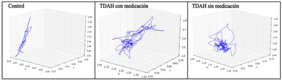 As an example, Figure 5 shows the trajectory of the head joint for one minute of a subject with a firm diagnosis of ADHD (centre), the same subject without medication (right) and a subject in the control group (left).