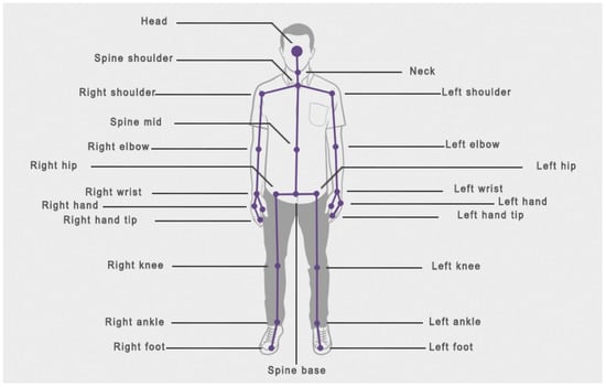 The identification of movement, posture, or a gesture made by a human body in real time is a difficult challenge because it has been found that the human body can perform a great deal of movement and it can have different size etc. []. Notwithstanding the above, after having carried out a series of tests with different technologies, the analysis of various technological devices, and the confirmation that Kinect has been previously used successfully in a wide range of research fields [,,,,,,,,,,], it has been concluded that the Kinect V.2 is a suitable device to recognize and capture the movement of subjects in a teaching/learning situation, and thus achieve the objectives of this research.