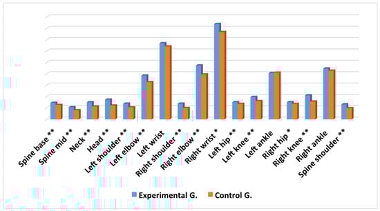 Average differences in movement for every joint in the experimental group and the control group. ** = p < 0.001; * = p < 0.05.