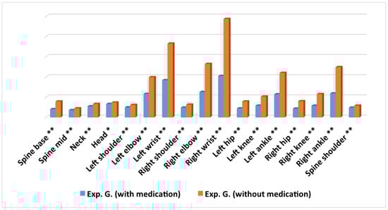 Average differences in movement for every joint within the experimental group with and without medication intake. ** = p < 0.001; * = p < 0.05.