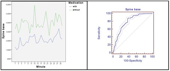 All of the above implies an area under the ROC curve with values of 0.79 for the base spine, 0.73 for the left elbow, 0.81 for the left wrist, 0.77 for the right elbow, 0.83 for the right wrist, 0.77 for the left hip, 0.79 for the right hip and 0.72 for the right ankle. For the rest of the joints analysed, except for head, neck and spine shoulder joints, the differences in movement were remarkable in practically all the minutes, but they did not remain constant over time. For the joints head, neck and spine shoulder, although there were peaks in which the amount of movement of the subjects without medication was much higher, at different times the group of subjects with medication recorded more movements than the group without taking medication.