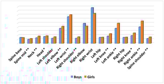 Results showed that girls obtained a higher average in movement in comparison with boys for 14 of the 17 joints analysed (Figure 10). Thus, the only joints in which boys obtained a higher average are spine base, right elbow and right wrist.