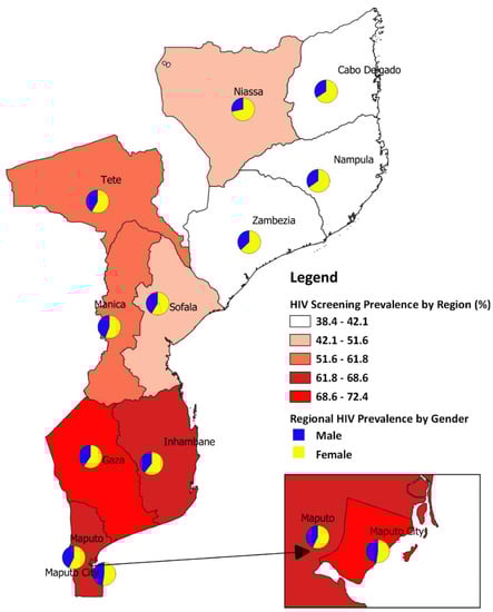 3.6. Spatial Map of Mozambique Showing Provincial HIV Screening Prevalence by Gender