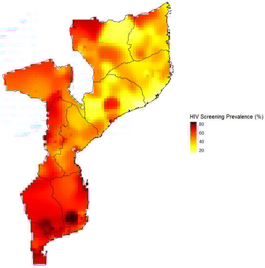 HIV screening is critical to treatment, care and prevention. Adequate HIV screening is integral to meeting the 90–90–90 targets made by the UNAIDS []. Our study sought to estimate the prevalence of HIV screening and its associated factors among Mozambicans in their reproductive age using the 2015 M-AIS dataset. To eliminate the masking of sub-regional estimates that characterized national and regional level analyses, we developed an HIV/AIDS screening prevalence surface map using spatial interpolation techniques to identify geographical areas with the highest and lowest HIV screening rates in Mozambique. Our results emphasize the importance of geographical-level variations and the impact of factors including gender, marital status, age, education, wealth index and place of residence on HIV screening. We found that being female, being presently or previously married, having at least a primary education, living in an urban area, and coming from a wealthy home were linked to a higher likelihood of being screened for HIV. Although some of these factors have previously been linked to HIV screening [,], their geographical-level distributions and contributions have not been studied in Mozambique.