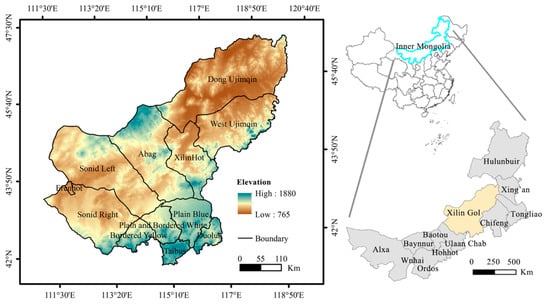 The Xilin Gol League (43°02′–44°52′ N, 115°13′–117°06′ E) is known as one of the four dominant natural grasslands in China; it borders the People’s Republic of Mongolia to the north (Figure 1). With a northern temperate continental climate, the Xilin Gol League features an average temperature of 0 °C to 3 °C, an average precipitation of 295 mm, an average relative humidity below 60%, and evaporation rates ranging from 1500 mm to 2700 mm. Annual sums of sunshine duration correspond to around 2800 h to 3200 h. The Xilin Gol League landform types include the shallow mountain/hill farming-pasturing interlaced zone, Hunshadake sandy land, and a degraded and desertified grassland zone. The Xilin Gol League covers an area of 2.026 × 109 hm2, of which 1.796 × 109 hm2 is grassland, 1.847 × 105 hm2 is the arable land area, and 1.436 × 105 hm2 is for the sowing of food crops. The permanent population of the Xilin Gol League is 1.055 million []. Agriculture is the main production source and grassland farming exists to supplement the agriculture.