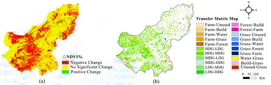 (a) Changes in the normalized difference vegetation index (NDVI) data from 1990 to 2015; (b) land-use transfer types from 1990 to 2015. (HDG: high-density grassland; MDG: mid-density grassland; LDG: low-density grassland).