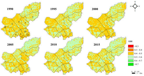 During 1990–2000, ecosystem health significantly deteriorated in the western part of the Xilin Gol League, especially in the Sonid Right Banner. From 2000 to 2015, the areas with a dropping EHI in the Dong Ujimqin Banner (located in the south of the Xilin Gol League), Sonid Left Banner, Sonid right Banner, Xilin Hot, and Bordered Yellow (located in the southwest of the Xilin Gol League) gradually expanded, meaning that the EHI of these league cities steadily dropped after 2000. However, the EHI of Dong Ujimqin Banner and Xilin Hot in the east of the study area improved when EHI values increased by more than the area where the EHI value decreased.