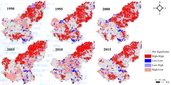 Univariate Moran’s I indexes for 1990, 1995, 2000, 2005, 2010, and 2015 were calculated as 0.279, 0.230, 0.226, 0.258, 0.274, and 0.169, respectively, which showed positive spatial correlation. To test whether Moran’s I was significant, Monte Carlo was used to simulate 999 tests in Geoda. All the results passed the significance test of 0.001, indicating that the spatial autocorrelation was significant at a 99.9% confidence level. From 1990 to 2000, Moran’s I index decreased, implying that the EHI spatial correlation gradually declined. From 2000 to 2010, Moran’s I index steadily increased and the EHI spatial distribution started to show a noticeable trend of clustering in the same direction. During 2010–2015, the EHI spatial autocorrelation in the study area suddenly declined.