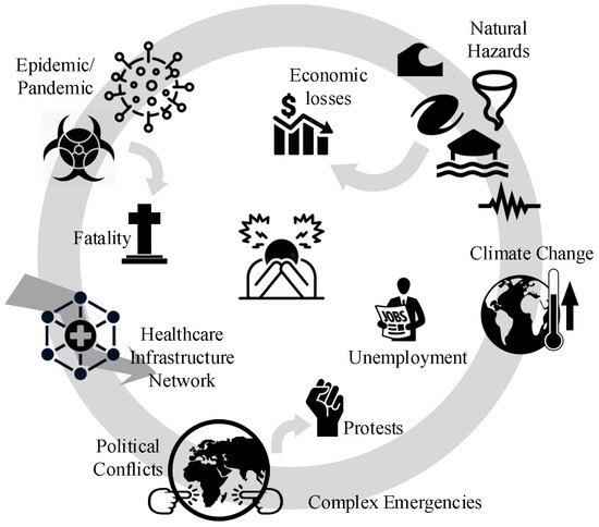 Arguably one of the most important tasks in any community is keeping the healthcare system as resilient as possible. Resilience refers to the capacity of a system, community, or society to adapt to potential hazards by resisting or changing in order to reach and maintain an acceptable level of functionality and structure [37,38]. The concept of resilience was first introduced in the field of psychology [39] and has been rapidly adopted by environmental [40] and social sciences [41]. Individual researchers have addressed the resilience of communities against natural hazards (e.g., climate-resilient [42], earthquake-resilient [43], flood-resilient [44], pandemic-resilient [45], and politically-resilient [46]).