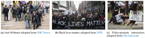 One form of mass gathering during the pandemic has been protesting or marching by different civil rights groups, and the U.S. has seen several such protests over the past three months. On 24 April, nearly 1500 people gathered at the Wisconsin State Capitol in Madison to protest. Two weeks later, the Wisconsin Department of Health Services confirmed 1986 cases of COVID-19. Of those, 72 people reported having attended a large gathering, though patients were not asked specifically if they had attended the protest [26]. It was observed that many protesters did not maintain a six-foot distance from others or wear masks. On 15 April, there was a protest in Lansing, Michigan against the state’s governor, Gretchen Whitmer, and her COVID-19 lockdown, Figure 3a. Again, there was no sign that people were taking the COVID-19 related public health advice seriously.