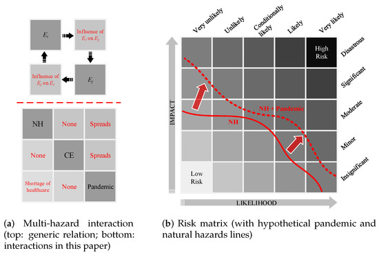Liu et al. [34] proposed a simple matrix approach to identifying the interactions between various hazards. According to Figure 4a (upper part), the interaction of any two hazards and can be determined by understanding their impacts on one another. For three hazard sources in this paper, such interactions are assessed in Figure 4a (lower part). While the single-hazard sources take the diagonal cells, their clockwise influence/interaction fill out the off-diagonal cells. For example, this matrix shows that occurrence of a natural hazard may spread the pandemic, while an ongoing pandemic does not change the probability of occurrence of a natural hazard. Each of these major hazard sources also has various sub-categories. For example, natural disasters include earthquakes, floods, and hurricanes, while pandemics and epidemics include outbreaks of COVID-19 or an intensified seasonal influenza.